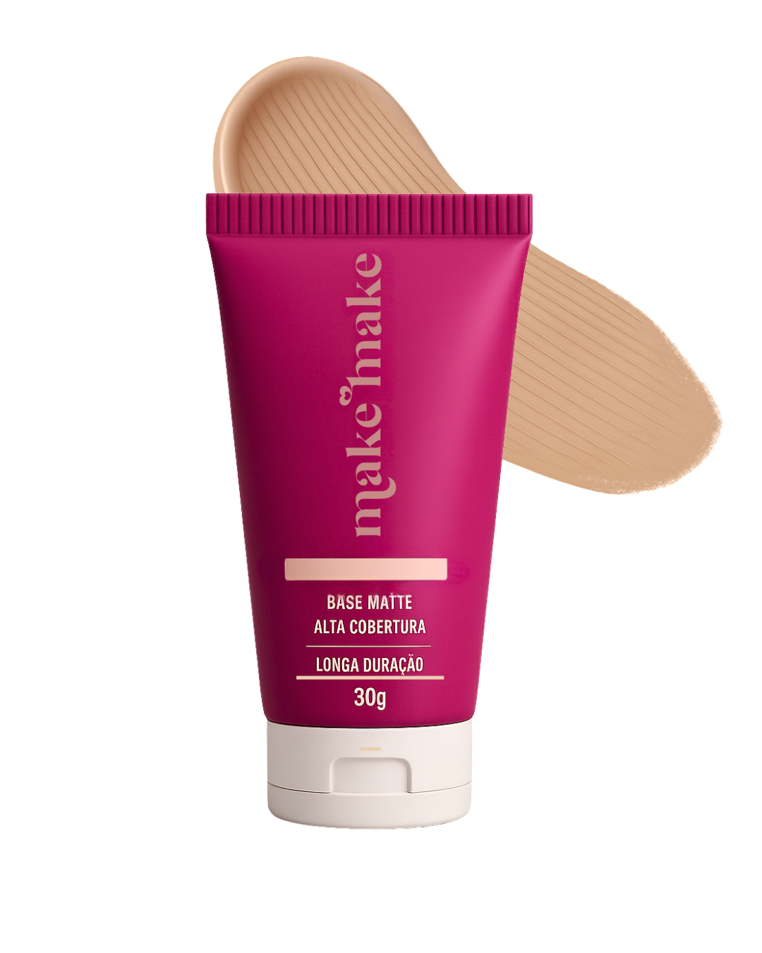 A Base Líquida da MakeMake entrega alta cobertura com efeito matte, cobrindo imperfeições com um acabamento natural e uniforme.