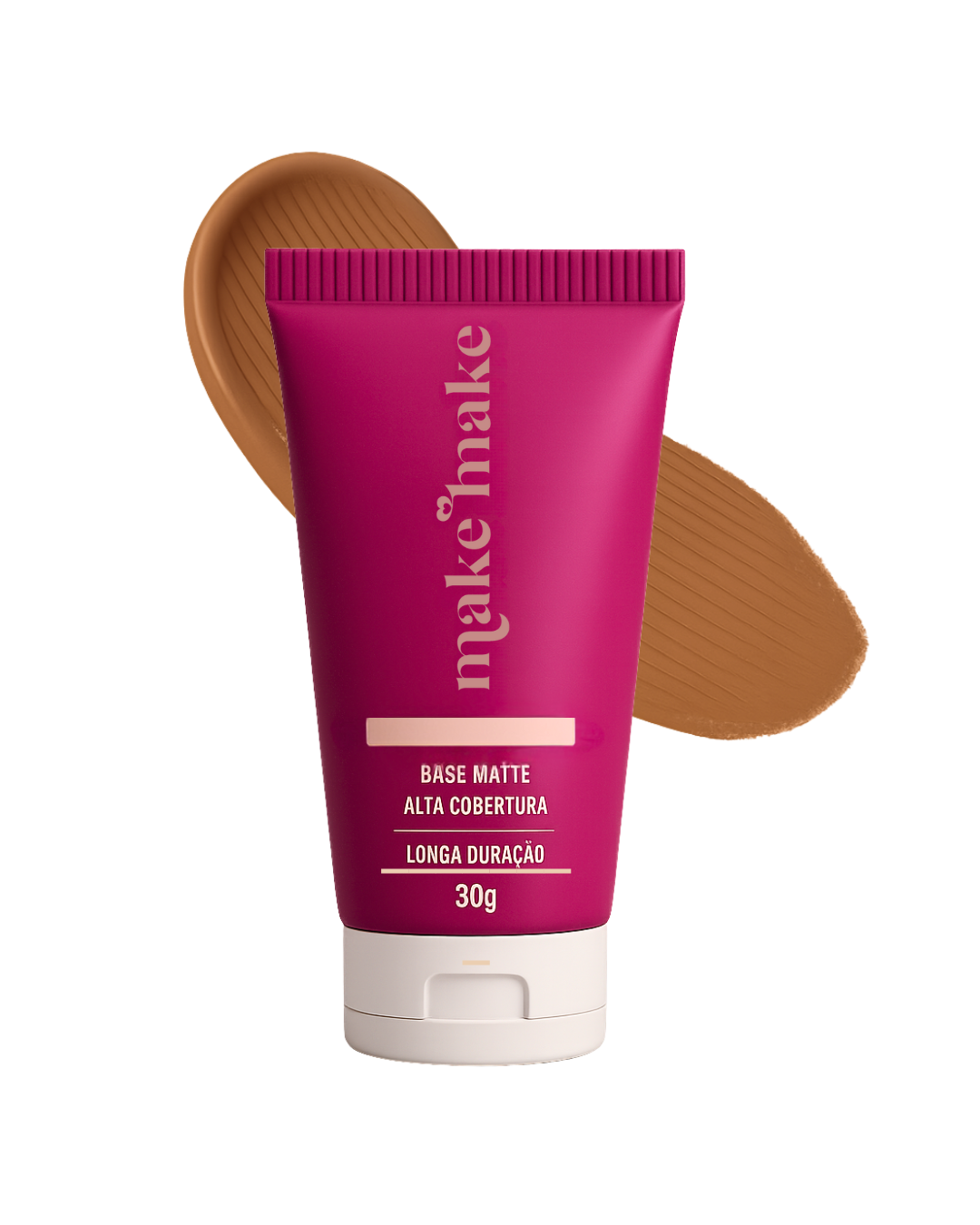 A Base Líquida da MakeMake entrega alta cobertura com efeito matte, cobrindo imperfeições com um acabamento natural e uniforme.